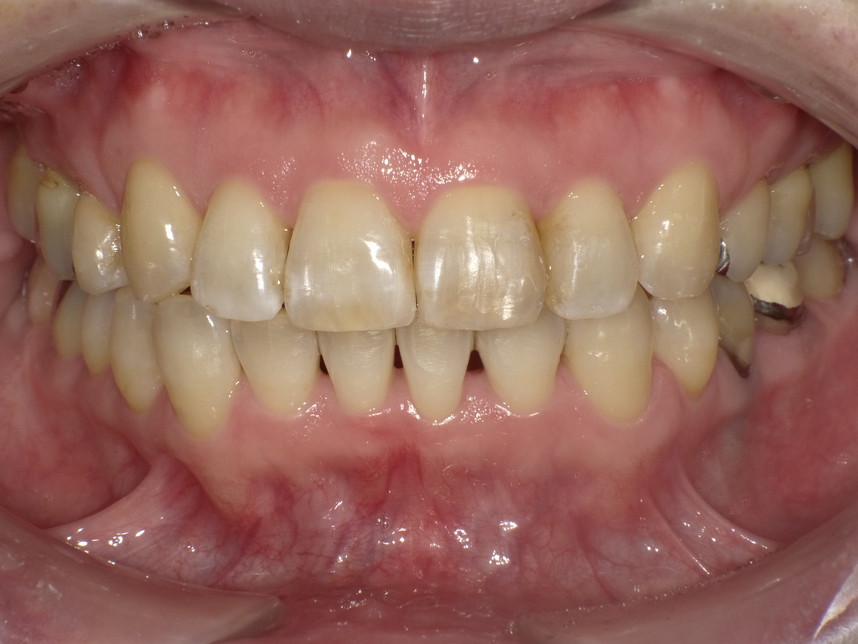 強度の口ごぼで、前歯だけでなく上の歯全体を後方に移動させた。矯正治療と併用して歯冠長延長術+歯槽骨整形術を行っている。見た目の改善はもちろんのこと、顎関節症状や咬み合わせが良くなっている。