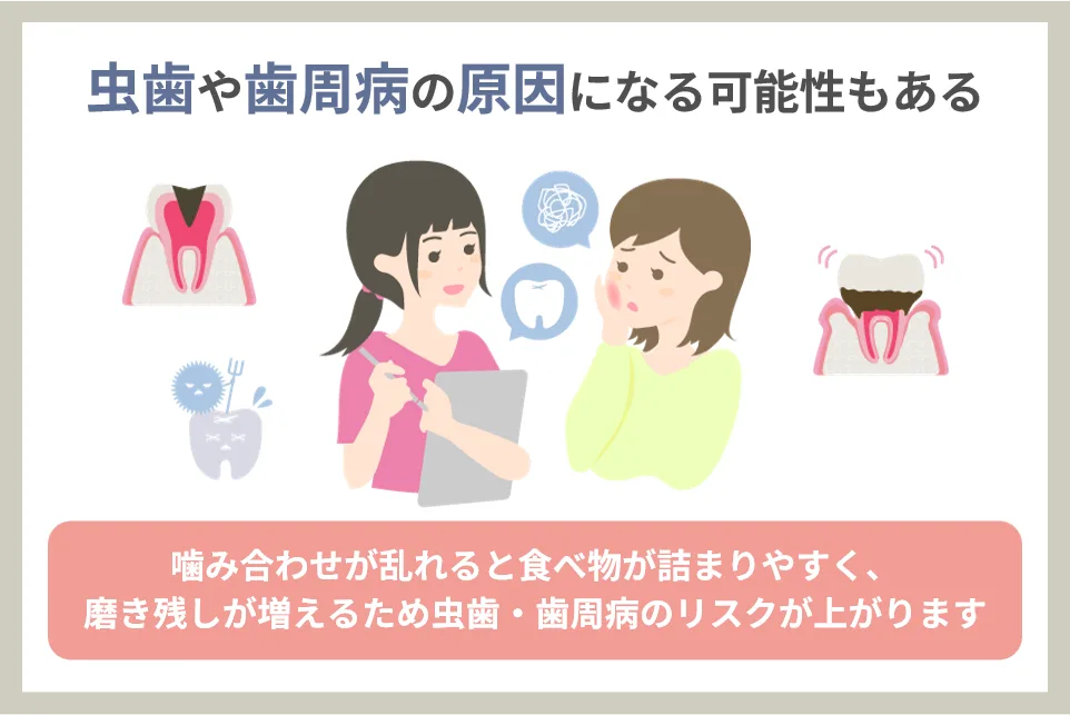 噛み合わせが乱れると食べ物が詰まりやすく、磨き残しが増えるため虫歯・歯周病のリスクが上がります。
